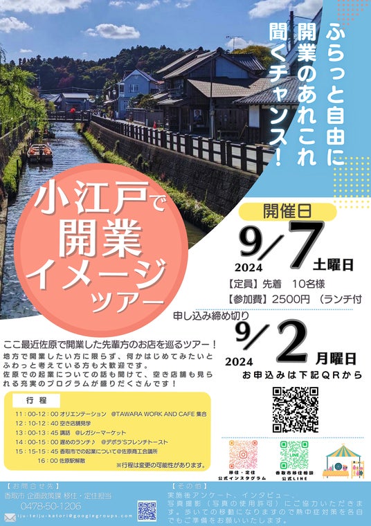 2024年9月7日(土)開催、千葉県香取市の観光地「小江戸佐原」での開業をイメージできる、日帰りツアーの参加者を募集いたします。