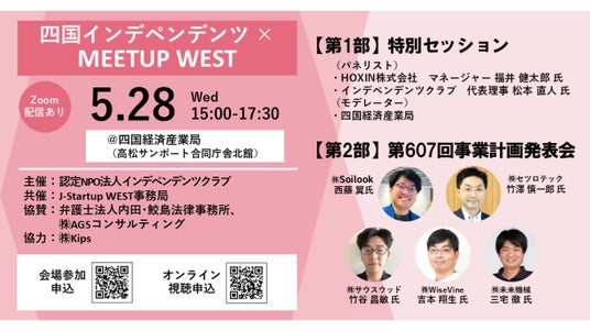 5/28(水)香川県高松市にて、J-Startup WEST選定企業(四国地域5社)が、投資家、事業会社、支援機関等向けに事業計画を発表する「四国インデペンデンツ×MEETUP WEST」を開催します。