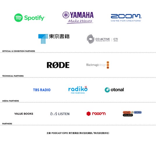 スポティファイジャパン株式会社 /ヤマハミュージックジャパン株式会社/株式会社ズーム/東京書籍株式会社/株式会社ウエイクアップ CTI JAPAN/RØDE Microphones/Blackmagic Design/株式会社TBSラジオ/株式会社radiko/株式会社オトナル/株式会社バリューブックス/株式会社OND