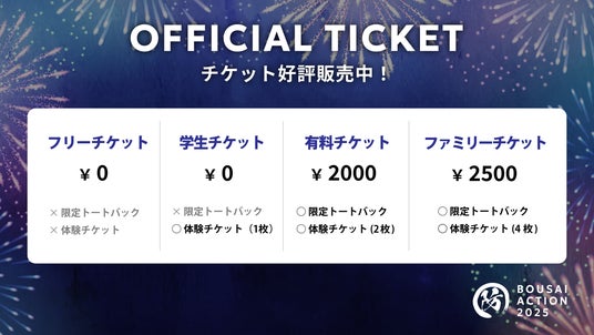 - 有料チケット:2,000円(トートバック・体験券2枚付き)