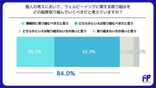 「積極的に取り組むべき」30.7%、「どちらかといえば取り組むべきだと思う」53.3%と、合計84.0%が前向きな姿勢を示しており、個人としてもウェルビーイングの必要性を感じていることがわかります。