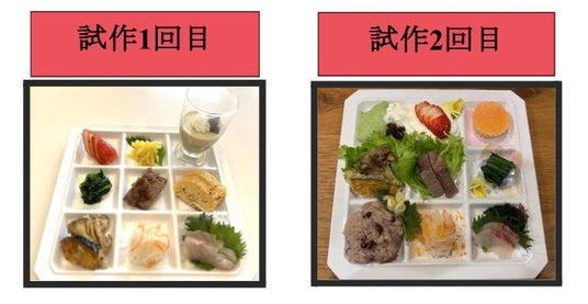 施設で試作した1回目はお皿に空白が多い見た目でした。2回目はシェフのアドバイスで見た目が華やかになりました
