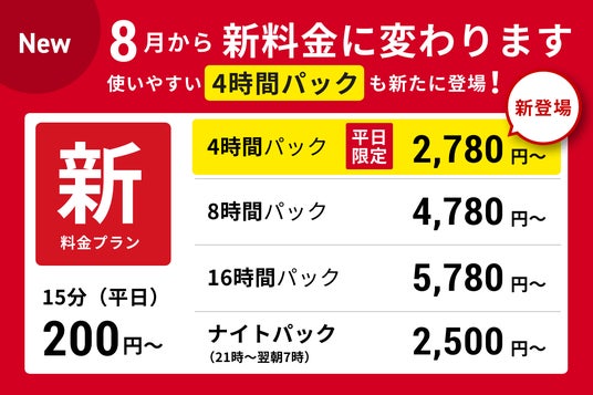 なお、8月1日(木)に料金改訂を行い、業界で最も短い料金パックとなる4時間パック※を新設しました。普段のお買い物やちょっとしたお出かけに是非ご利用ください。