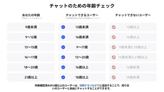 これはユーザーの安全性向上に向けた重要な取り組みであり、年齢に応じた適切なコミュニケーションを促進するとともに、成人ユーザーと未成年者との間で発生しうる不適切なやり取りを防止することを目的としています。