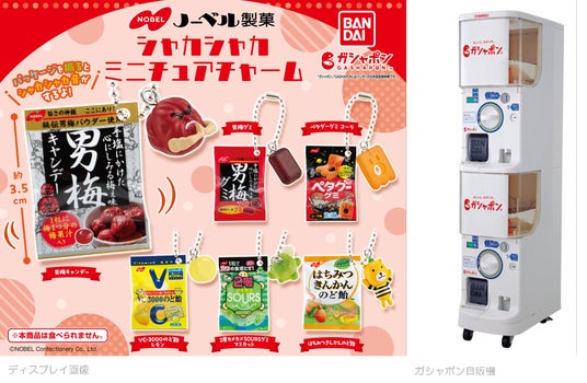 ノーベル製菓株式会社(本社:大阪府大阪市)は、株式会社バンダイ(本社:東京都台東区)とコラボレーションし、大人気のお菓子商品をミニチュアサイズで再現した「ノーベル製菓 シャカシャカミニチュアチャーム」(1回300円・税10%込、全6種)を2024年7月第3週から順次、全国のガシャポンバンダイオフィシャルショップ、玩具売場、量販店、家電店などに設置されたガシャポン自販機シリーズにて発売いたします。