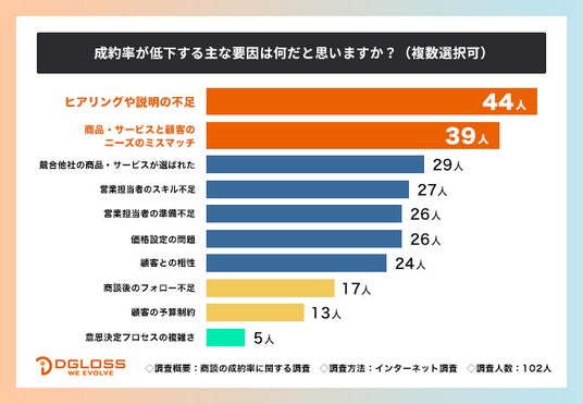 ・成約率低下の主な要因は「ヒアリングや説明の不足」(44人)が最多、「商品・サービスと顧客ニーズのミスマッチ」(39人)が続く