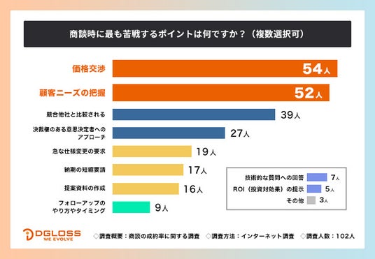 ・商談時に最も苦戦するポイントは「価格交渉」(54人)で、次いで「顧客ニーズの把握」(52人)、「競合他社と比較される」(39人)