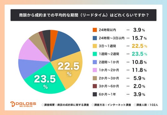 次に「商談から成約までの平均的な期間(リードタイム)はどれくらいですか?」と質問したところ、最も多かった回答は『1週間~2週間』(23.5%)で、次いで『3日~1週間』(22.5%)、『24時間~3日以内』(15.7%)という結果になりました。