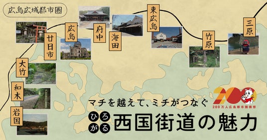 広島市の都心部を中心に広島県、山口県及び島根県の3県にまたがる33市町で構成されている広島広域都市圏内の市町うち、西国街道が通る10市町(東から広島県三原市、竹原市、東広島市、海田町、府中町、広島市、廿日市市、大竹市、山口県和木町、岩国市)で構成する“西国街道”まち起こし協議会では、圏域内を東西に横断する「西国街道」を活用し、まちの活性化を図るため、西国街道に関する情報発信やイベント実施などに取り組んでいます。
