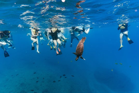 海中で出会えたアオウミガメ。シュノーケリング中は白化している珊瑚を見る機会もあり温暖化の影響を実感。