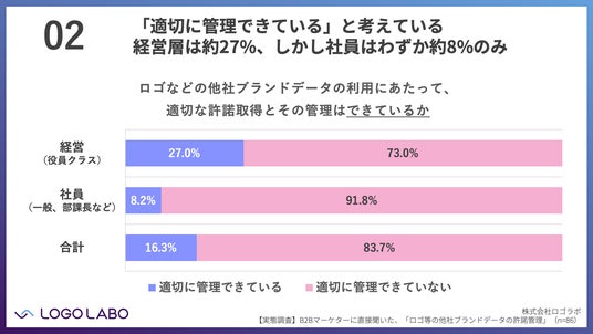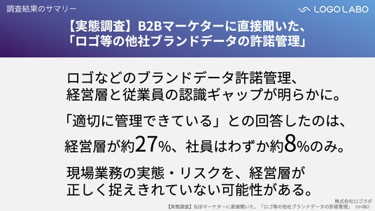 この調査は、B2B企業に所属するマーケティング部門に関連する従業員・経営層を対象に行い、ロゴ等の他社ブランドデータの扱いにおいて、経営と従業員の認識に大きなギャップがあることが明らかになりました。