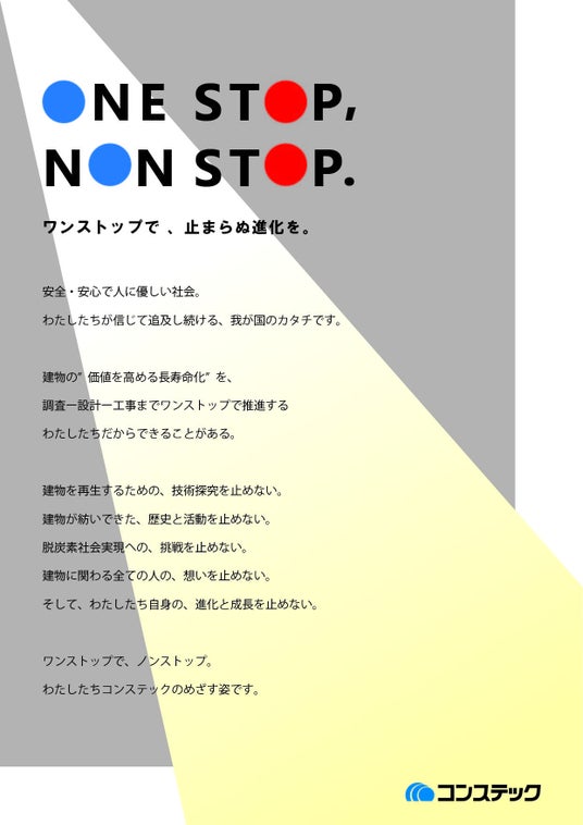 株式会社コンステック(本社:大阪市中央区、代表取締役社長:茶家義明)は、採用活動の強化を目的に、コーポレートスローガン「ONE STOP, NON STOP.」を掲げました。このスローガンは、当社の企業姿勢である「正しい診断、たしかな施工」と共に、建物の長寿命化に向けて調査から設計、工事までをワンストップで提供する総合力と、建物の再生に対する強い想いが込められています。