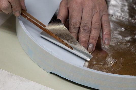 神社仏閣の装飾や、雅やかな調度を支えてきたその伝統は、現代においても職人の手によって磨き続けられています。わずかな歪みも許されない鏡面のような貼り上げ、複雑な文様の溝や際まで、息を詰めて箔を運ぶ精緻な手仕事。そうした工程を経て、素材そのものが金やプラチナ、黒の輝きで形作られたかのような奥行きのある表情が立ち上がります。