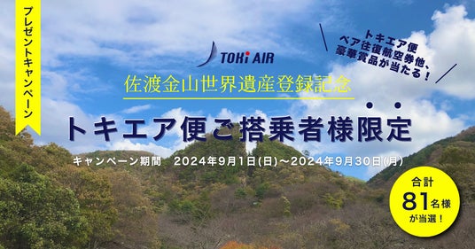 新潟拠点の地域航空会社トキエア株式会社(本社:新潟県新潟市 代表取締役:長谷川政樹)は、佐渡金山が世界遺産登録された事を記念し、航空券や佐渡産コシヒカリが当たるキャンペーンを実施することをお知らせいたします。