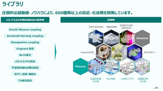 さらに、本技術は幅広い有機合成反応に適用でき、北海道大学工学研究院・伊藤研究室(伊藤肇教授〈弊社取締役〉)を中心に、多様な反応系での実証が進められてきました。これまでに数百件に及ぶ反応・化合物の合成実績があり、特に今回の協業で焦点を当てる不溶性/難溶性化合物の合成では、豊富な知見と成果を有しています。