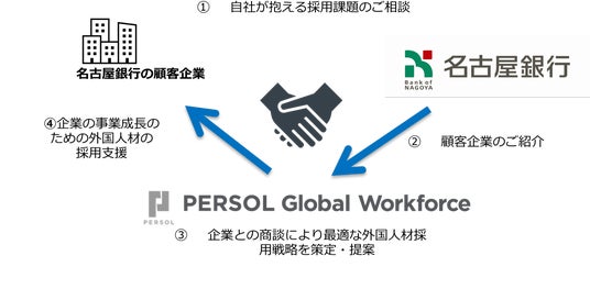 本業務提携は、PERSOL Global Workforceの外国人材に関する各種サービスを、名古屋銀行の顧客企業が抱える人事戦略上の課題に合わせ、提案・提供するものです。人材不足の解消に向け、高まる特定技能・外国人材へのニーズに対応するとともに最適な外国人材採用の戦略を策定・提案し、採用・受け入れまでをサポートし、持続可能な地域社会の実現を目指します。