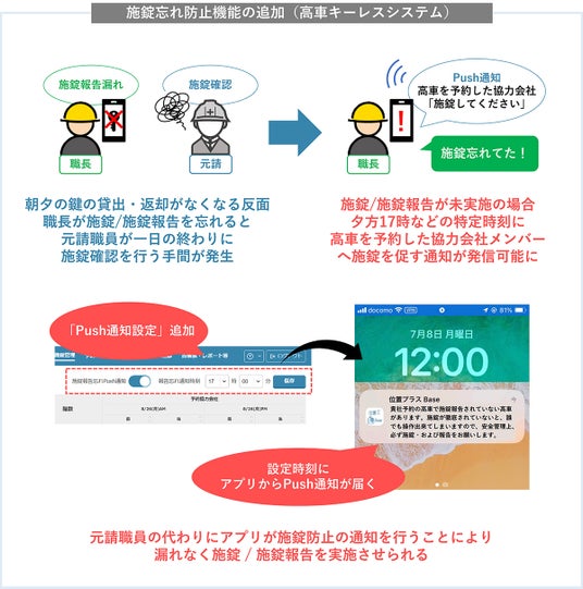 高車キーレスシステムでは、朝夕の鍵の貸出・返却がなくなる代わりに、職長は高車の使用後に施錠を行い、元請に施錠報告をシステム上で行う必要がありますが、これが徹底されず、元請側で施錠の確認を行う手間がかかるといった運用上の課題がありました。今回のアップデートでは、元請職員や協力会社職長のスマホアプリを通じて、高車キーレスシステムの解錠/施錠の情報を自動で収集したうえで、元請職員が指定する夕方17時などの特定の時刻に、未施錠の高車の協力会社職長に「施錠報告がされていない旨」の通知をして施錠を促す機能を拡充しました。これにより高車キーレスシステムの運用上の課題が解消し、元請職員の確認の手間や時間が低減します。
