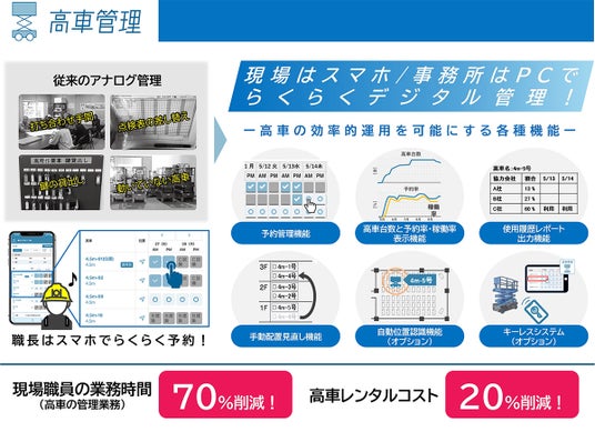 現場で使用する全ての高車の予約調整や配置探索などをアプリ上で行い、使用協力会社と紐づけることで、使用料および修理費等の明確化と現場での予約調整業務を軽減できるアプリです。オプションの「高車キーレスシステム」も併せて利用することで、デジタルキーによる解錠と施錠が可能となり、鍵の受け渡しが不要で紛失などのトラブルもなくなるため、煩雑化された鍵の管理をスマートに行うことができます。