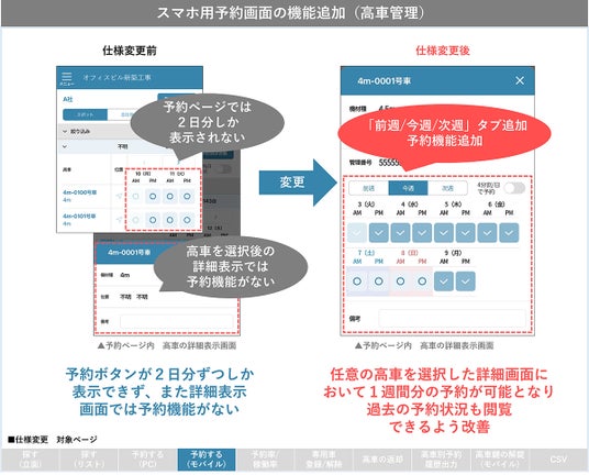 スマホ用の予約画面は、従来の仕様では表示の大きさやボタンの押し易さを優先し、「2日分」の予約状況を表示し、過去の予約状況は閲覧できない仕様となっており、連続した予約が取りづらい、昨日以前の予約状況を確認したうえで同じ高車を予約したい等のご要望を頂いておりました。