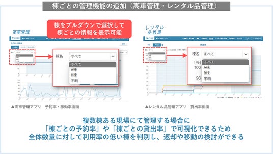 高車管理、レンタル品管理の各画面において、左上に棟名のプルダウンを追加する機能拡充を行い、全棟まとめた表示に加えて「棟ごと」の予約率/貸出率を確認できるようになりました。本機能の拡充により、複数棟を管理する現場において、棟をまたいで高車やレンタル品の移動を行っても詳細に記録できるため、管理責任や費用負担が明確になります。