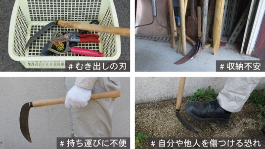 私たちは、「刃物に触れず、誰もが安心して使える鎌をつくりたい」という想いから、この商品の開発をスタートさせました。従来の鎌には、収納中に刃で手を切ってしまうリスクや、地面に置いた鎌をうっかり踏んでしまう危険、刃カバーのズレによる不安などがありました。