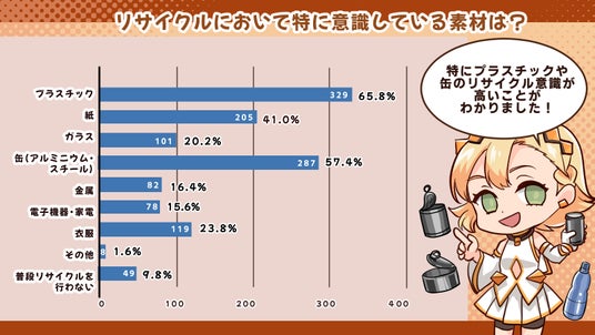 500人に複数回答可でアンケートを取ったところ、「プラスチック」が最も多く329票と全体の約66%の人がプラスチックをリサイクルしているようです。