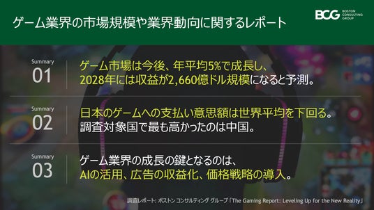 経営コンサルティングファームのボストン コンサルティング グループ(以下、BCG)は、ゲーム業界の市場規模や業界動向について解説したレポート「The Gaming Report:Leveling Up for the New Reality」(以下、レポート)を発表しました。