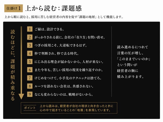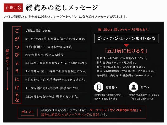 一見シンプルな縦書きコピーの連打で構成されていますが、その内部には3つの独立した仕掛けが設計されており、本リリースにてその構造を全公開いたします。