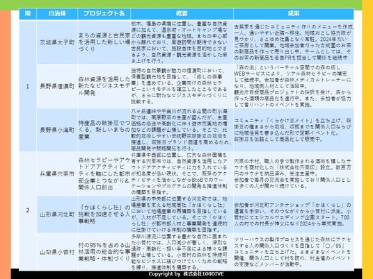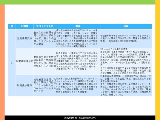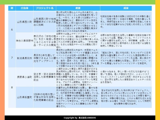 100DIVEでは、2021年から11期24の地域で実施し、368名が参加。30チームが活動を継続し、8つの事業が法人化を実現しています。地域やチームごとの取り組み内容、事業化の進捗なども含めて、”100DIVEのこれまで”を下記の画像にまとめております。