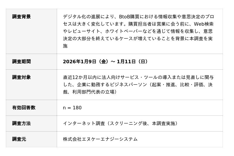 デジタルセールスを支援する株式会社エヌケーエナジーシステム(本社:東京都世田谷区、代表取締役社長:野田和也)は、BtoB法人取引における購買担当者や決裁者約180名を対象に「BtoB購買プロセスにおける営業との関わり方」に関する調査を実施しました。本リリースでは一部を抜粋しお知らせいたします。