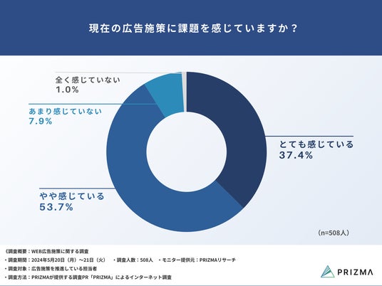 現在の広告施策への課題感としては、『とても感じている(37.4%)』、『やや感じている(53.7%)』を合わせると、9割以上と非常に多いことが分かりました。