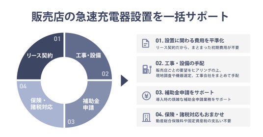 国内でEV・PHEVの普及が進む中、身近な拠点での充電体験はユーザーの安心と再来店の契機になり得ます。一方で、急速充電器の導入には高額な初期費用に加え、機器選定・設計・施工調整・補助金申請・保守運用など、多岐にわたる実務が伴い、販売店の負担となっていました。