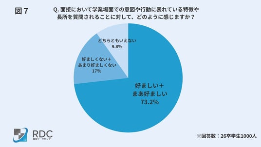 2026年卒学生1,000人への調査では、「学業場面での行動や長所を質問される面接」を73.2%が「好ましい」「まあ好ましい」と回答(図7)。