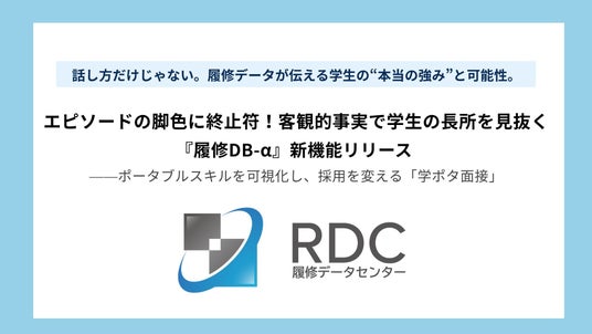 株式会社履修データセンターは、大学の履修履歴を活用した採用支援ツール『履修DB-α(リシュウディービーアルファ)』に、学業場面に表れるポータブルスキル「学ポタ(※)」を可視化する新機能を追加しました。