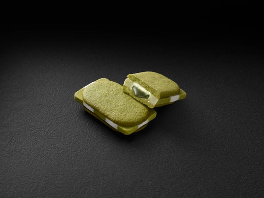 市松模様のショコラクッキーのセンターに、煎茶の特製ソースを仕込みました。 その上から釉のかかりを想わせる 煎茶のラング・ド・シャをあしらいました。 緑のラング・ド・シャとショコラ、ソースのハーモニーが織部の風雅で奥行のある世界に誘います。