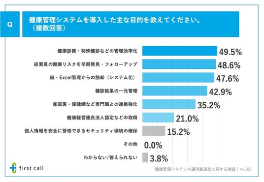 ■健康管理システムの導入目的、「健康診断・特殊健診などの管理効率化」や「従業員の健康リスクを早期発見・フォローアップ」が上位