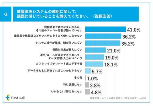 続いて、「健康管理システムの運用に関する課題」を調査したところ、「健診結果や判定は見られるが、その後のフォロー体制が整っていない」が41.0%、「産業医や保健師などがシステムをうまく使いこなせない」が36.2%、「システム操作が複雑、UIが使いにくい」が35.2%となりました。
