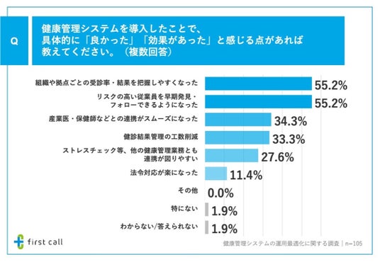 加えて、「健康管理システムの導入によるメリット」を調査したところ、「組織や拠点ごとの受診率・結果を把握しやすくなった」が55.2%、「リスクの高い従業員を早期発見・フォローできるようになった」が55.2%、「産業医・保健師などとの連携がスムーズになった」が34.3%となりました。
