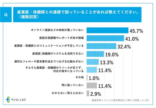 加えて、「産業医・保健師との連携で困っていること」について調査したところ、「オンライン面談などの体制が整っていない」が45.7%、「面談日程調整やレポート共有が煩雑」が41.0%、「産業医・保健師とのコミュニケーションが不足している」が32.4%となりました。