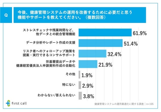 続いて、「健康管理システムの運用を改善するために必要だと思う機能やサポート」について調査したところ、「ストレスチェックや残業時間など、他データとの統合管理機能」が61.9%、「データ分析やレポート作成の支援(簡単なダッシュボード、経営層向けレポート自動生成など)」が51.4%、「リスク者へのフォローアップ施策を提案・実行できるコンサルサポート」が32.4%となりました。