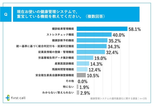 さらに、「現在利用している健康管理システムで、重宝している機能」について調査したところ、「健診結果管理機能」が58.1%、「ストレスチェック機能」が40.0%、「健康診断予約機能」が35.2%となりました。