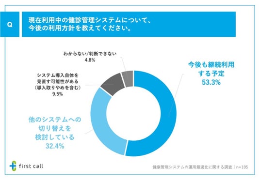 ■現在利用中の健診管理システムについて、53.3%が「今後も継続利用する予定」、一方で、32.4%が「他のシステムへの切り替えを検討している」実態