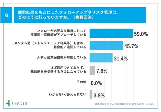 また、「健診結果をもとにしたフォローアップ・リスク管理方法」について調査したところ、「フォローが必要な従業員に対して産業医・保健師がアプローチしている」が59.0%、「メンタル面(ストレスチェック結果等)も含め、総合的に確認している」が45.7%、「人事と産業保健職が対応している」が31.4%となりました。
