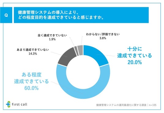 次に、「健康管理システムの導入による、目的の達成状況」について調査したところ、「十分に達成できている」が20.0%、「ある程度達成できている」が60.0%となりました。