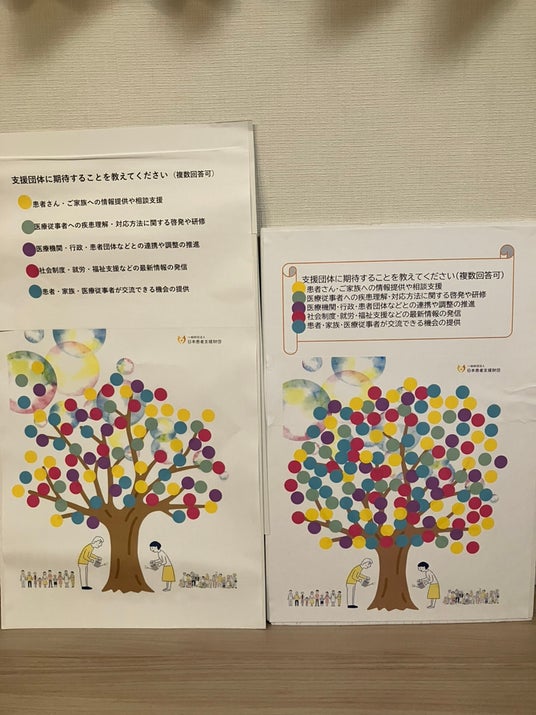 当日は、展示ブースにて当財団の活動内容をスクリーンに投影し紹介し、パンフレットを配布しました。同時に来場者に「支援団体に期待することは何か」のアンケートも実施しました。回答選択肢別にシールを準備し、シールを花に仕立て、木のイラストに貼ることで花を咲かせた木が完成しました。(1人複数回答あり)〈参照:写真3〉。皆さまのご協力により、のべ223枚のシールを貼っていただくことができました。以下、回答の多かった順です。