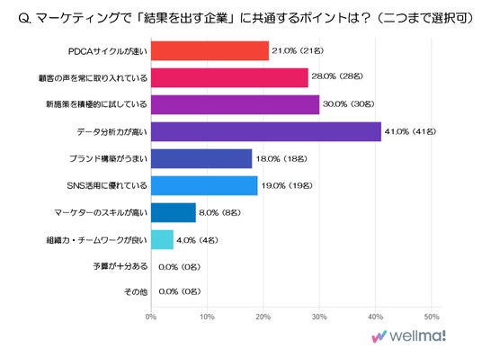 こうした現場の疑問や課題を明らかにするため、自社のサービスや価値をマーケティング担当者1万人に直接届けられる次世代型プラットフォーム「Wellma(ウェルマ)」(https://wellma.jp/ )は、2025年3月18日にマーケター100名を対象に、「マーケティングで "結果を出す企業" に共通するポイントは?」という独自アンケート調査を実施しました。
