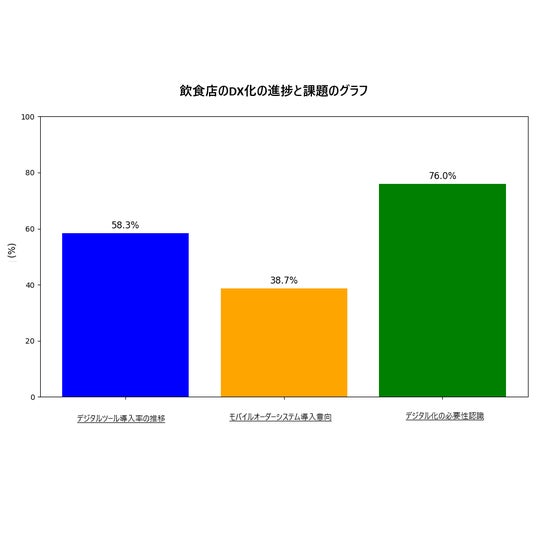 一方、株式会社ぐるなびの調査(2022年)によれば、76.0%の飲食店がデジタル化の必要性を認識し、38.7%がモバイルオーダーシステムの導入を検討しています。しかし、コスト面や効果の不透明さが課題となり、DX化が進んでいない現状があります。