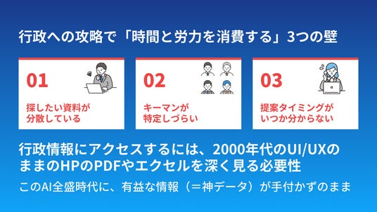 国・中央省庁から自治体まで行政情報は各機関に広く分散しており、政策形成から入札に至る一連のプロセスを民間企業が網羅的かつタイムリーに把握することは容易ではありません。この官民間の情報の非対称性が、官民連携の機会損失と調達プロセスの不透明性を生み続けてきました。