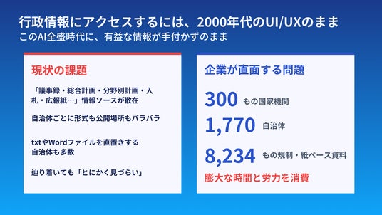 これまで、行政や議会の膨大な情報は非構造的なデータのまま埋もれており、民間企業が活用するには高い専門性と多大なコストが必要でした。