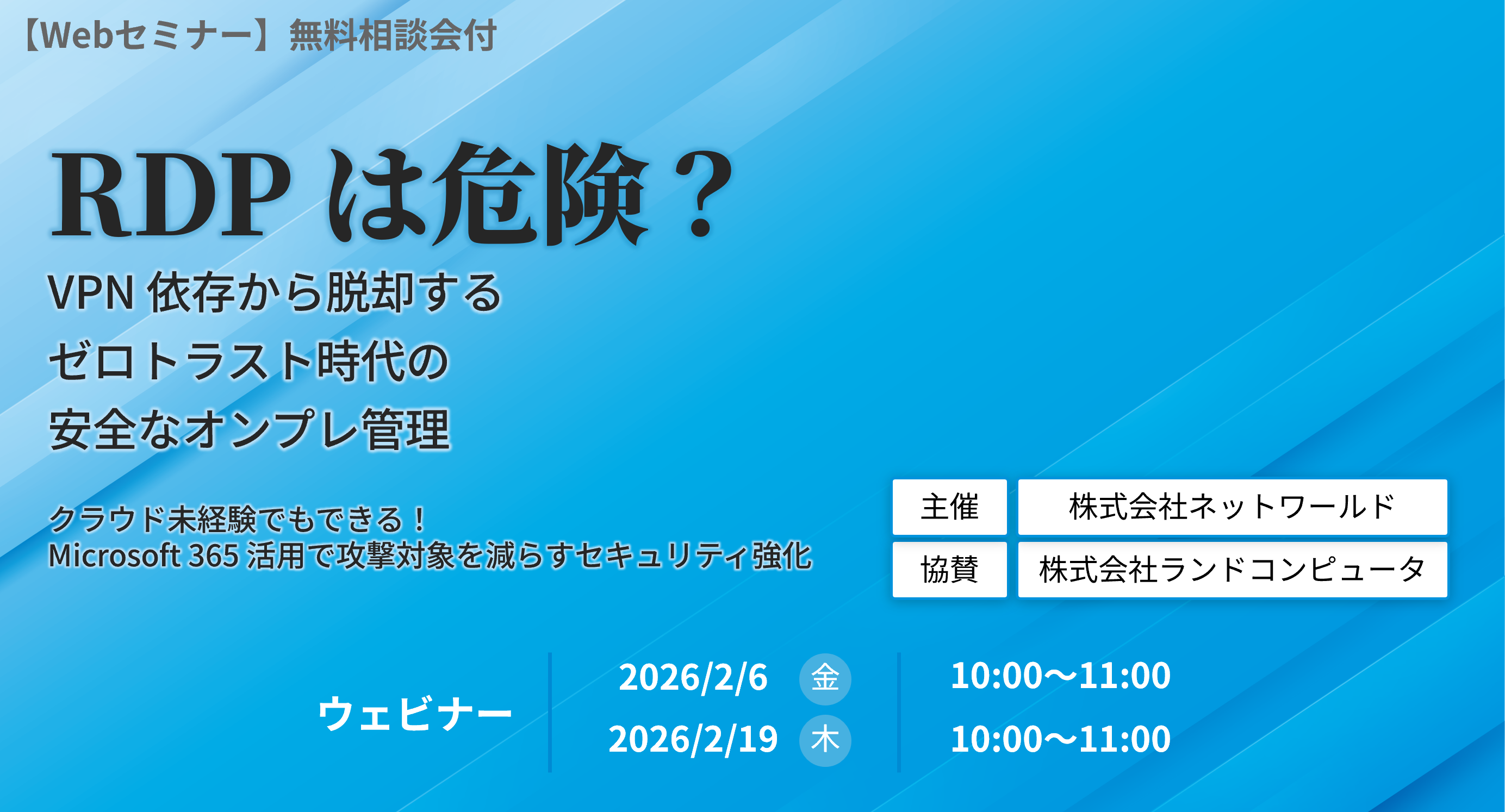 2026年2月6日(金)と2月19日(木)の2回、株式会社ランドコンピュータ(本社:東京都港区)は、Webセミナー「RDP は危険?VPN 依存から脱却するゼロトラスト時代の安全なオンプレ管理~クラウド未経験でもできる!Microsoft 365 活用で攻撃対象を減らすセキュリティ強化~」を共催いたします。